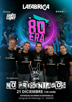 El próximo 21 Diciembre, nos espera una noche mágica en La Fábrica con No Presentados en vivo, trayéndonos lo mejor de los 80s. ¡Será una noche llena de energía y buena música que no querrás perderte!